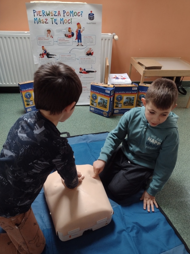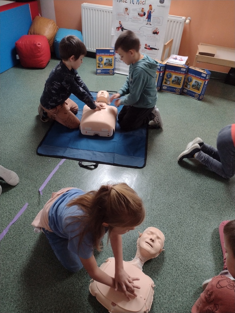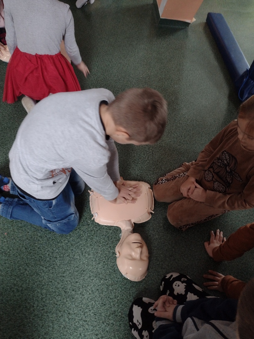 8 grudnia uczniowie z klasy 1 a rozpoczęli naukę udzielania pierwszej pomocy przedmedycznej osobie, która straciła przytomność. Najpierw rozmawiali o tym czym jest pierwsza pomoc i komu jej należy udzielić. Na zajęcia zaprosiliśmy panią higienistkę, która rozwiała wiele wątpliwości dzieci. Potem każdy próbował ćwiczyć uciski reanimacyjne na fantomach Ania. Na lekcji wykorzystaliśmy materiały opracowane przez bank PKO BP - poradnik "Odkryj moc pierwszej pomocy". Jak na pierwszy raz poszło całkiem dobrze.