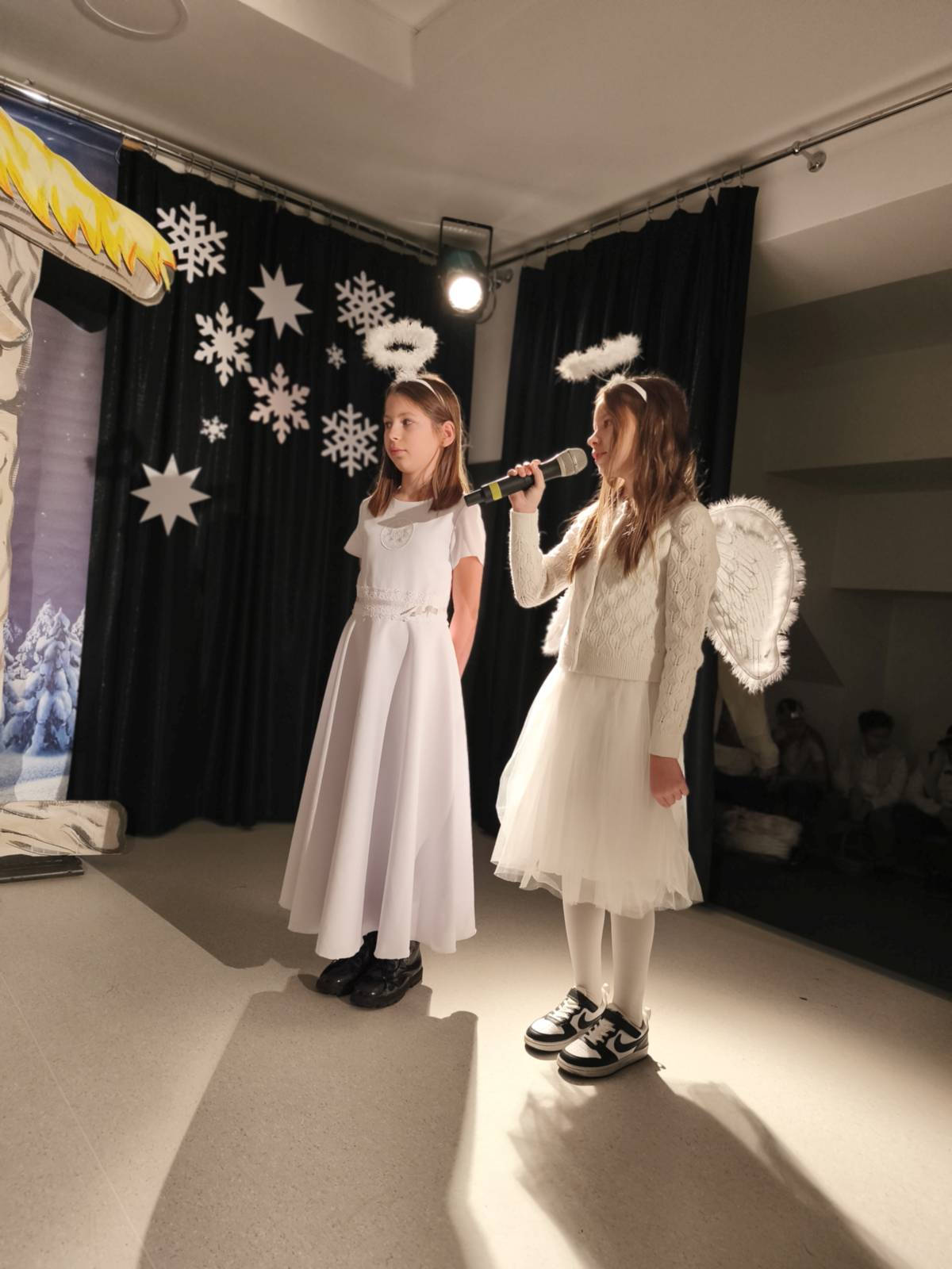Występ przygotowali uczniowie z klasy 4b, 5a i 8a, którzy z wielkim zaangażowaniem wcielili się w role Maryi, Józefa, aniołów, pasterzy i Trzech Króli. Starannie wykonane stroje, nastrojowa scenografia oraz kolędy i pastorałki wykonywane przez zespół „Perełki” wprowadziły wszystkich w bożonarodzeniowy nastrój.