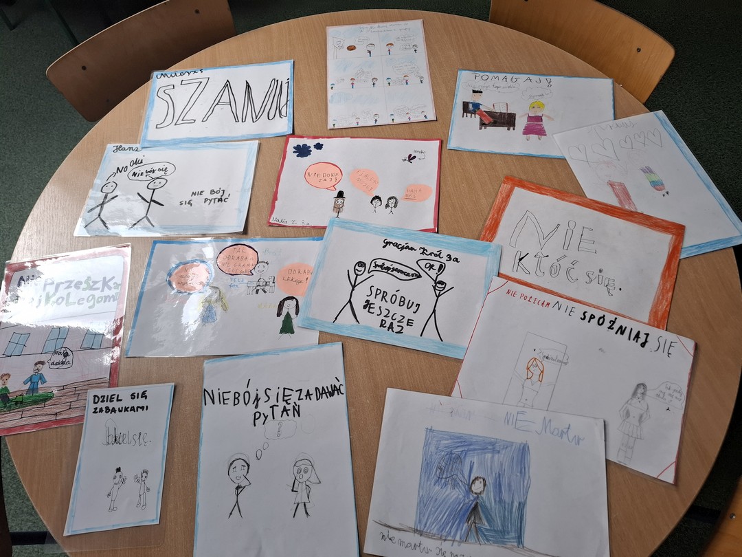 Uczniowie świetnie poradzili sobie z interpretacją przysłów. Na bazie poznanych mądrości ludowych dzieci wspólnie stworzyły graficzny ,,Kodeks właściwego zachowania” podczas pobytu w świetlicy. Każde przysłowie zostało zilustrowane – powstały barwne rysunki i plakaty, które ozdobiły świetlicę i przypominają wszystkim uczniom o tym, jak ważna jest kultura osobista, życzliwość i odpowiedzialność w codziennych relacjach z innymi.