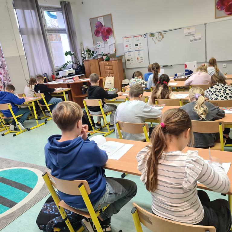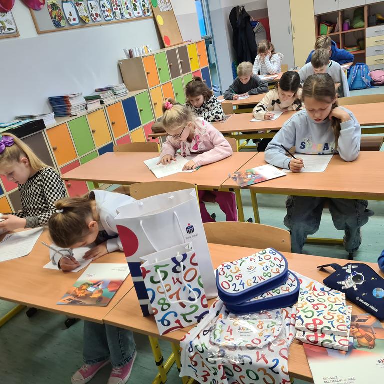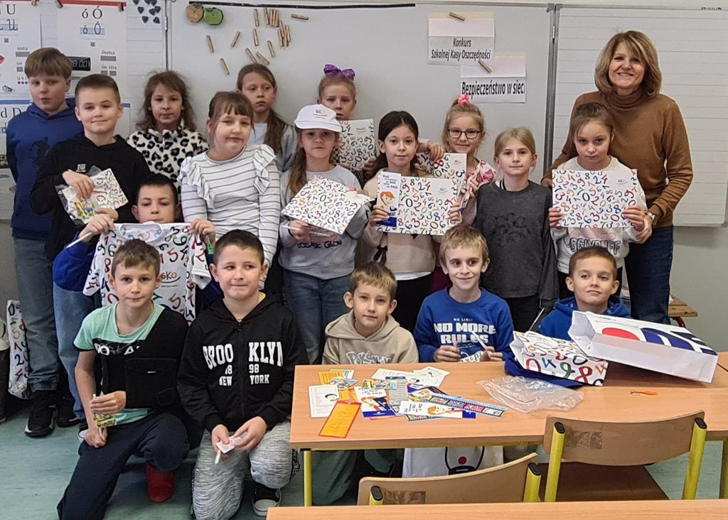 W dniu 18.11.2025 uczniowie z klas II i III przystąpili do konkursu, organizowanego przez opiekunów Szkolnej Kasy Oszczędności, pod hasłem BEZPIECZNI W SIECI. Zadanie miało formę testu z możliwością wyboru właściwej odpowiedzi. Uczestnicy dysponowali pomocą w postaci poradnika SKO-owicz bezpieczny w sieci. Wśród pytań testowych znalazły się zagadnienia związane z ochroną danych osobowych, tworzeniem trudnych do złamania haseł, kodem PIN, złośliwym oprogramowaniem.